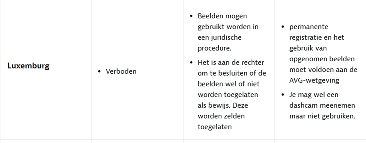 Het is mijn niet duidelijk hoe het nu zit met het gebruik van een dashcamcamera in Luxemburg. het lijkt verboden, maar toch mogen de beelden gebruikt worden in een juridische procedure. dit is toch tegenstrijdig. Kan ik een boete krijgen als die toch aan is ?