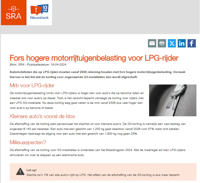 Ik las een artikel dat per 1 januari 2026 de motorrijtuigenbelasting (mrb) voor lpg rijders fors verhoogd zou worden, dit om elektrisch rijden te stimuleren. Dit terwijl er maar 1 % van de autorijders op lpg rijdt... Klopt dit en zo ja, kan de ANWB nog bezwaar maken bij overheid?